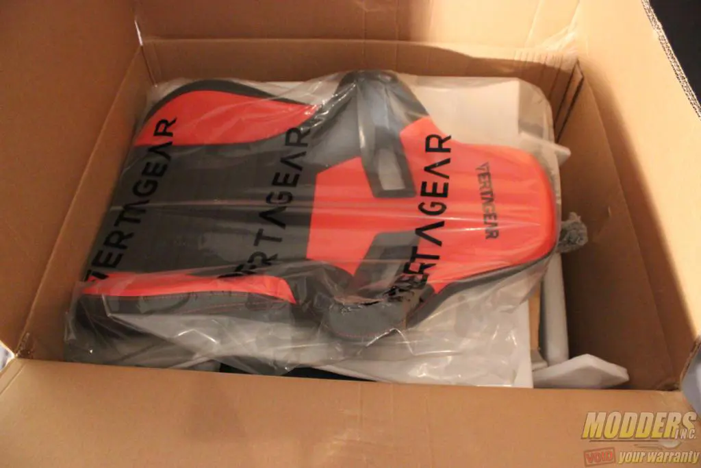 Inside the box, everything is sufficiently padded and nicely stacked inside to prevent damage to the chair or other components. We can see the actual chair portions wrapped in plastic with the Vertagear name.