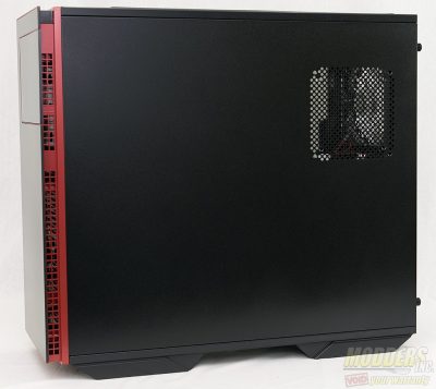 The business side of the case features a large, tinted case window that bevels outwards towards the center. this gives a little more room for tall CPU coolers. Front ventilation is provided by the square holes on the front panel.