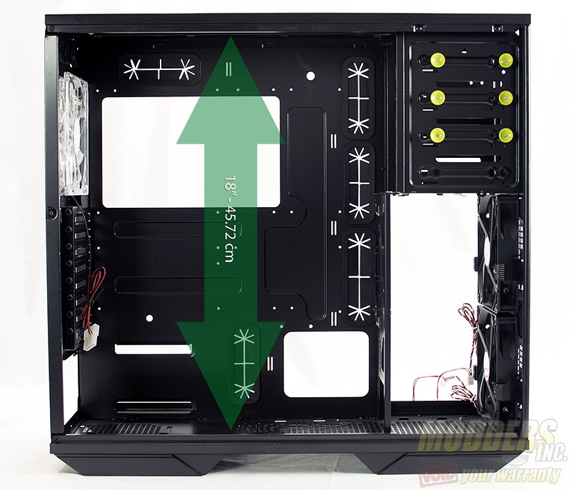 Top to bottom internally the case measures 42.72cm or 18 inches. from the hard drive cage mounts to the rear, the case measures in at 38.1cm or 15 inches. From the top of the CPU socket to the inside edge of the case I measured 19.36cm or 75/8 inches.
