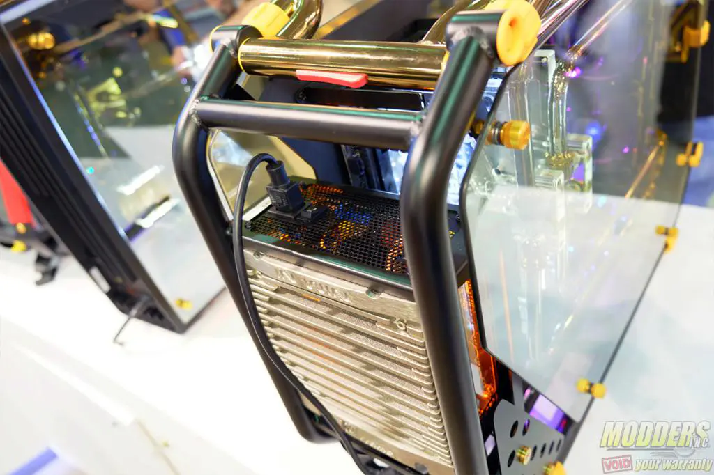 The new D-Frame 2.0 takes inspiration from a chopper frame moreso than a dune buggy with a slightly angled back and cleaner welds than D-Frame 1.0. It is available in gold/black with a tempered side-panel window and yellow accents/braces. It supports the massive In Win Signature Series Power supply and is designed specifically to be compatible with it, continuing on the motorcycle inspired look with the Signature Series PSU looking like an engine block.