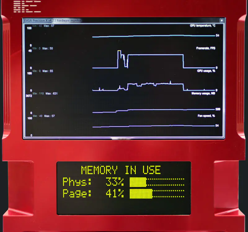 To minimize the dust in the case I added two large foam filters and two large fans for superior airflow and cooling. Monitoring the system’s performance in real time during gameplay was also important so I added two display screens.