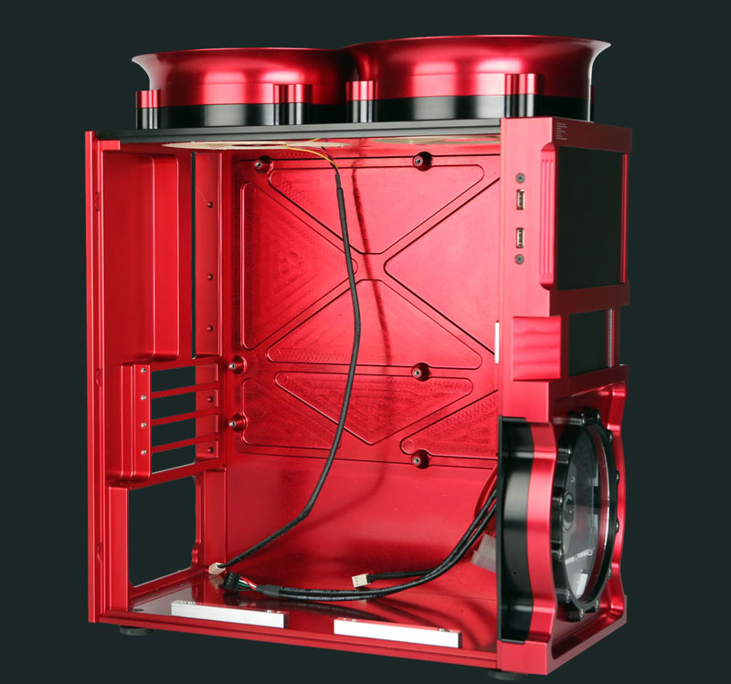 The XYNOS G3 is unlike any case you have seen before. The case starts out as 120lbs of aluminum blocks and after machining weighs just 16lbs. Made of 100% Billet T6 Aircraft Grade Aluminum the XYNOS G3 Computer Case is the first of its kind. The XYNOS G3 case has a built in 7″ display. This screen extends your desktop and allows you to run your favorite utility for real time monitoring of Graphic card resources. Below this is a 4 line by 20 Character LCD module display which can be used for monitoring additional system resources. For example, Page file, Physical memory in use, CPU usage, as well as other resources. Both displays are USB powered and plug into a standard main board USB 2.0 header. All the air flow through the case is pulled through 25PPI 12.7mm (.5″) thick foam filters. Dual 140mm (5.5″) Noctua fans blow directly down over the Ram, CPU, 5.25″ hard drive, and video cards.