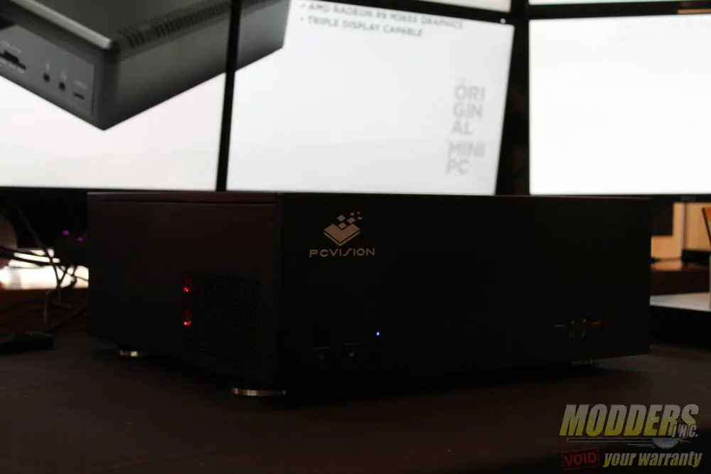 Right in the middle of the room was a massive 12-simultaneous display system powered by an AMD Radeon R9 M365X. Each display was connected via 12 HDMI ports to the small 1U rack-mountable system with an unused DVI port to spare.