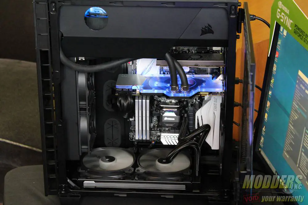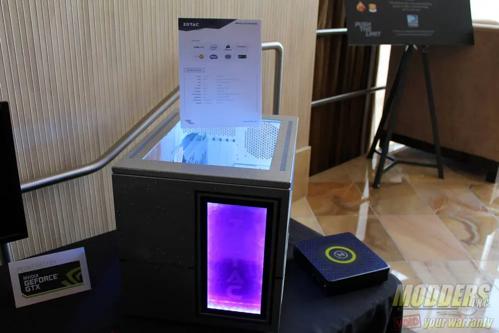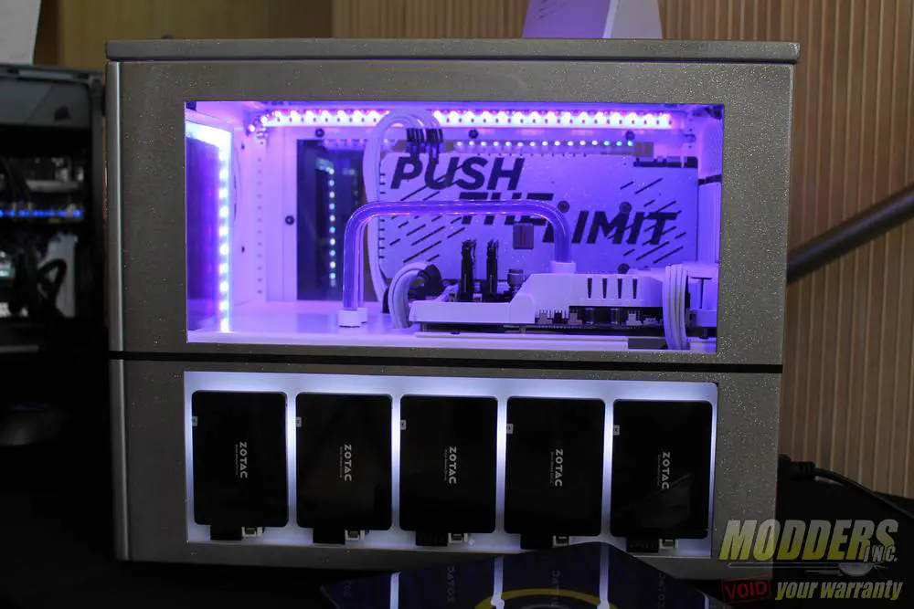 These SSDs as well as Zotac’s GTX 980Ti AMP! were also in full showcase mode inside Bob Stewart and Rod Rosenberg’s custom Caselabs casemod as well. The case had a frosted metallic paint, custom slim reservoir at the front with a row of Zotac SATA SSDs lined up on the sides.