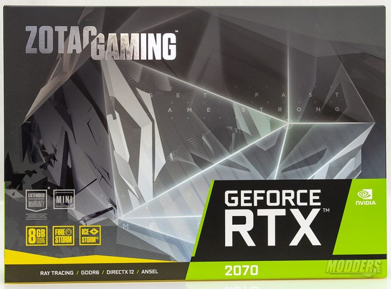 Zotac doesn’t deviate too far from their established box art with the RTX 2070 mini. On the front of the box, there is geometric graphics along with the product name. Flipping the box over and taking a look at the backside will give you a lot more information on the GPU housed inside as the backside of the box.