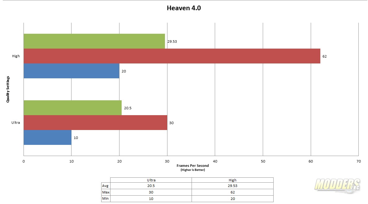 Heaven 4.0 uses the latest Unigine graphics engine that immerses the users in a magical steampunk world. The world features villages on flying islands, an dirigible, and a majestic dragon as a center piece of the town. Haven is a GPU intensive benchmark that can really show off the potential of the GPU under Direct X 11.